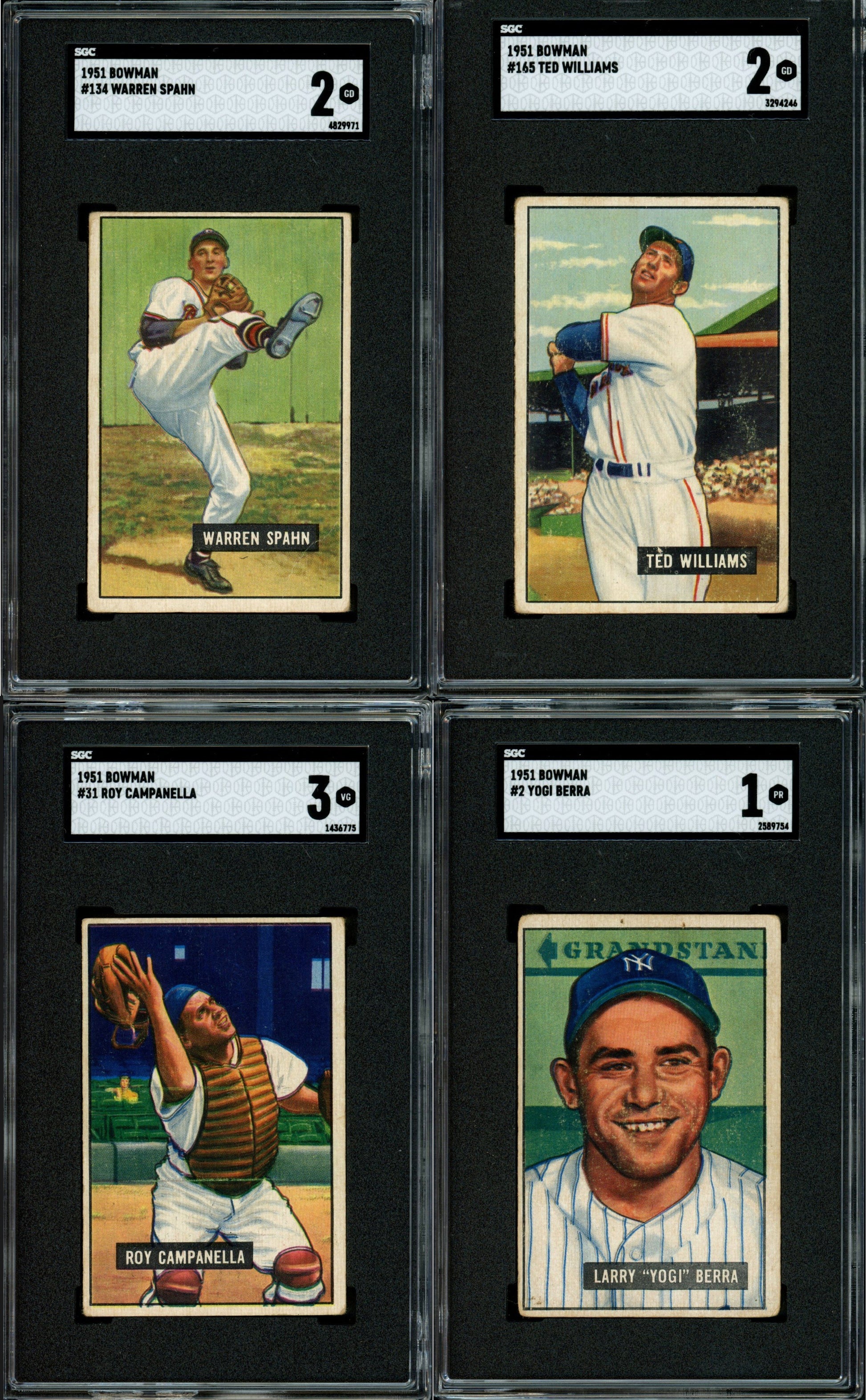 1951 Bowman Baseball Set Break 324 Spot Random Card. The set is highlighted by: #253 Mickey Mantle Rookie PSA 1, #305 Willie Mays Rookie PSA 3, #31 Roy Campanella SGC 3, #232 Nellie Fox Rookie SGC 3, #165 Ted Williams SGC 2, #80 Pee Wee Reese SGC 2.5, #134 Warren Spahn SGC 2, and #2 Yogi Berra SGC 1. 8 total cards have been graded by PSA and SGC in this 1951 Bowman Baseball set break. 324 cards total in this set break.