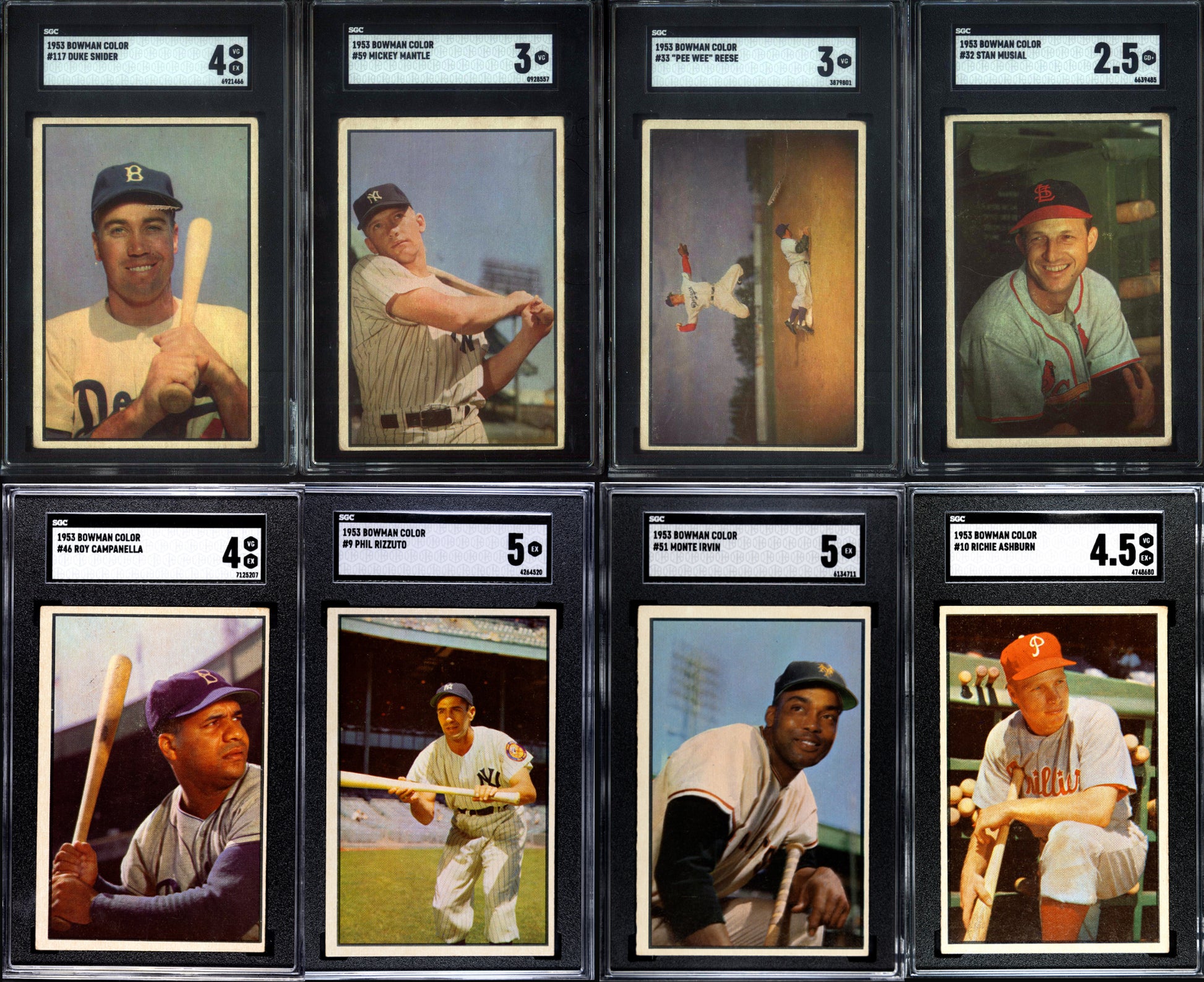 1953 Bowman Color Complete Set Break 160 Spot Random Card. The set is highlighted by the #59 Mickey Mantle SGC 3, Pee Wee Reese SGC 3, Phil Rizzuto SGC 5, Roy Campanella SGC 4, Monte Irvin SGC 5, Duke Snider SGC 4, Stan Musial SGC 2.5, and Richie Ashburn SGC 4.5. 8 total cards have been graded by SGC in this set break.