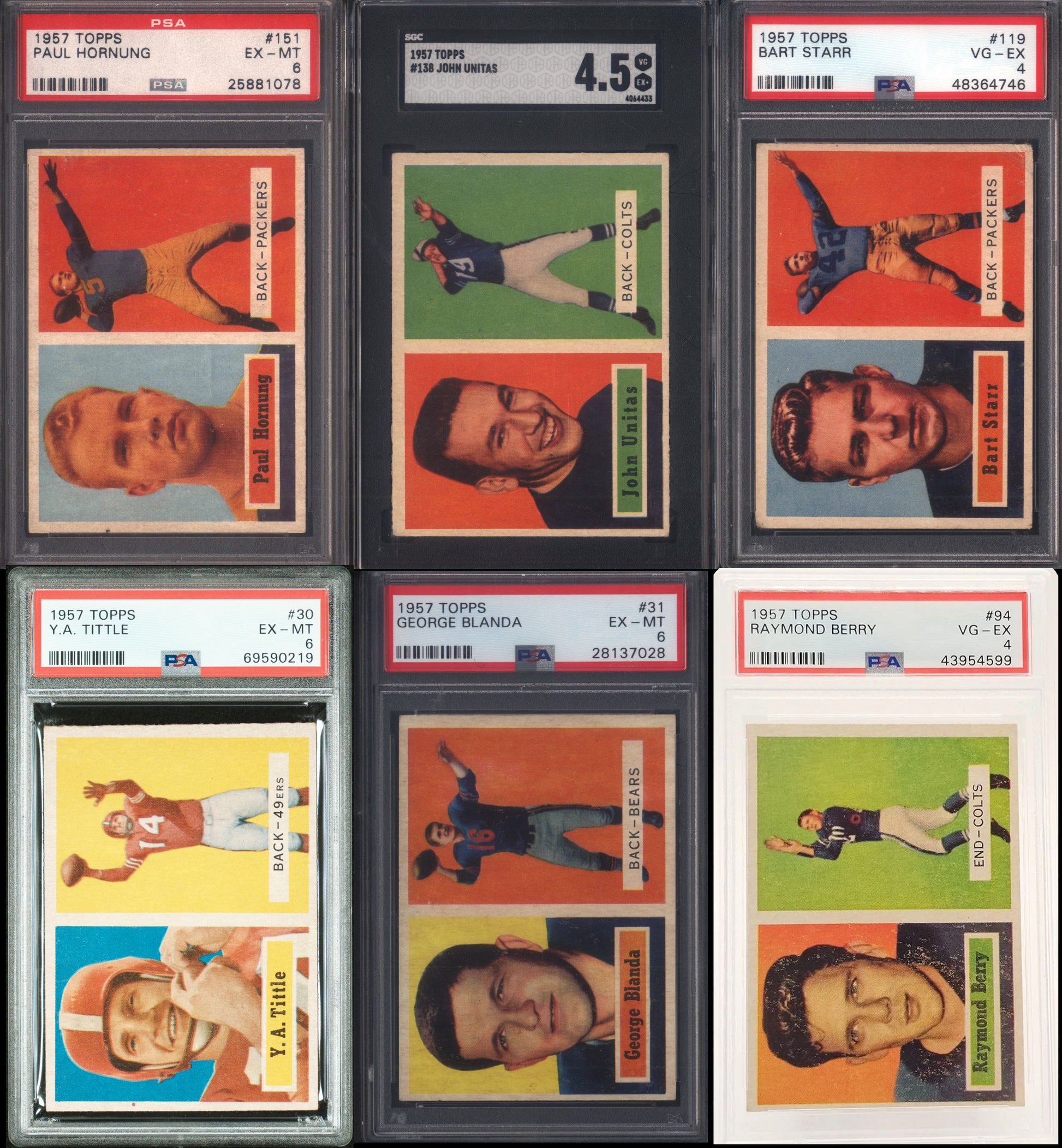 1957 Topps Football Set Break 154 Spot Random Card. This set is highlighted by the Bart Starr Rookie PSA 4, Johnny Unitas Rookie SGC 4.5, Paul Hornung Rookie PSA 6, Raymond Berry Rookie PSA 4, Y.A. Tittle PSA 6, and George Blanda PSA 6. 6 total cards have been graded by PSA & SGC. There are a total of 154 cards in this 1957 Topps Football set break.