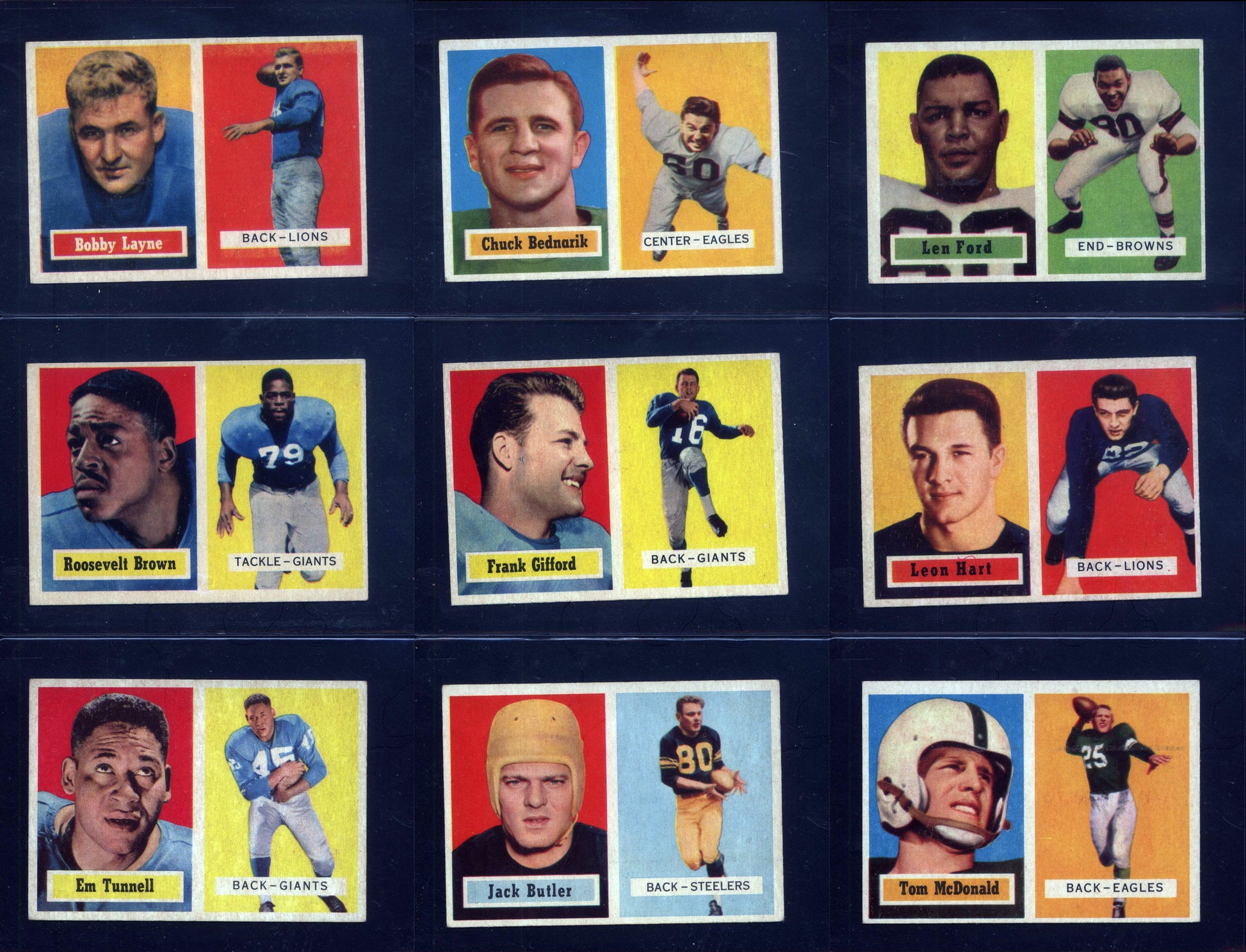 The balance of the set is ungraded and ranges mainly from VG/EX to Near Mint and averages EX to EX/MT with some better/lesser. Some of the other highlights include: #11 Roosevelt Brown (EX/MT), 15 Jack Butler Rookie (EX), 32 Bobby Layne (EX), 49 Chuck Bednarik (EX), and Frank Gifford (EX/MT). All 154 spots will be given out at random after the set break sells out!