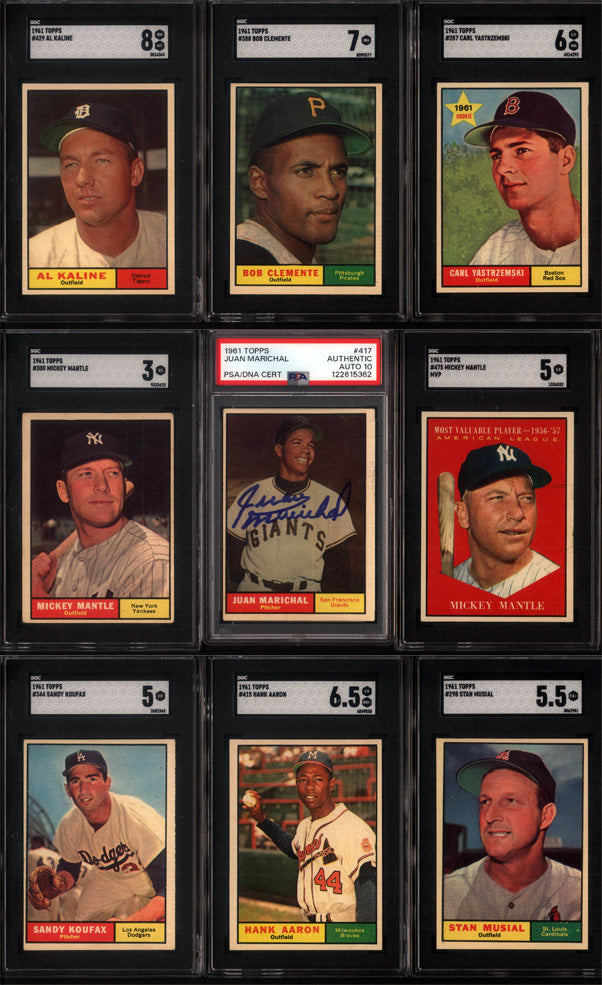 1961 Topps Baseball Set Break 587 Spot Random Card. This set is highlighted by: Mickey Mantle SGC 3, Mickey Mantle MVP SGC 5, Juan Marichal Signed Rookie PSA Authentic w/ 10 Auto, Roberto Clemente SGC 7, Al Kaline SGC 8, Carl Yastrzemski 2nd Year SGC 6, Sandy Koufax SGC 5, Hank Aaron SGC 6.5, Stan Musial SGC 5.5, Roger Maris All Star SGC 7, Frank Robinson SGC 7, Ernie Banks PSA 6, Mickey Mantle All Star SGC 2, Ron Santo Rookie PSA 6, WS Game #2 w/ Mickey Mantle SGC 6, HR Leaders w/ Mickey Mantle SGC 6.5, Willie Mays SGC 4, Roger Maris PSA 4, Yogi Berra SGC 5, Billy Williams Rookie SGC 4.5, Bob Gibson SGC 5.5, Richie Ashburn SGC 5, Warren Spahn SGC 6, Harmon Killebrew SGC 6, Duke Snider SGC 6.5, Bill Mazeroski SGC 6, Nellie Fox SGC 6, Robin Roberts SGC 5, Gil Hodges PSA 6, Ted Kluszewki SGC 4, Willie Mays All Star SGC 2, Billy Martin SGC 6, Early Wynn SGC 7, Willie McCovey PSA 4.5, Brooks Robinson SGC 5, Whitey Ford SGC 5, Bobby Richardson PSA 5, Dick Groat SGC 3.5, Rocky Colavito PSA 6, and Junior Gilliam SGC 6. There are a total of 40 cards that are graded by PSA and SGC in this set break. 587 total cards in this 1961 Topps baseball set break.
